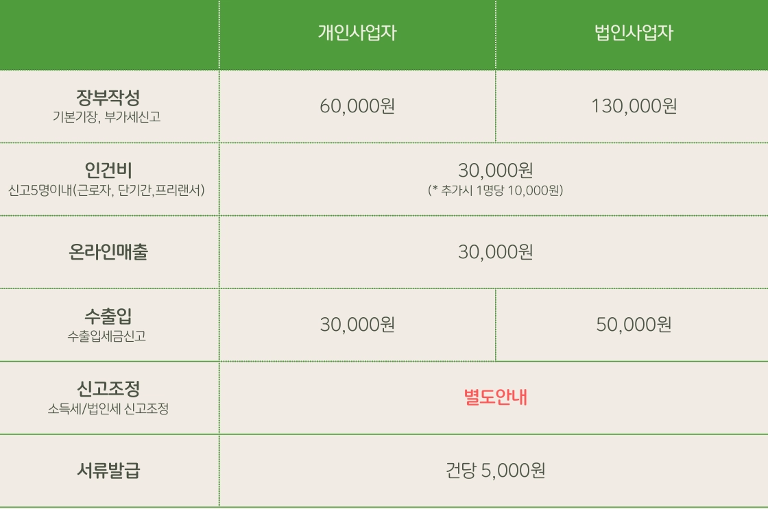 세무기장료는 고객님의 업종·규모·자료량 등을 종합해 상담 후 확정됩니다.